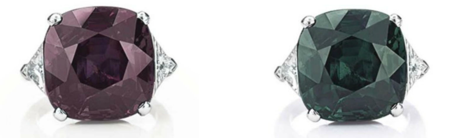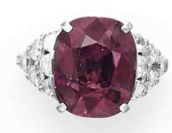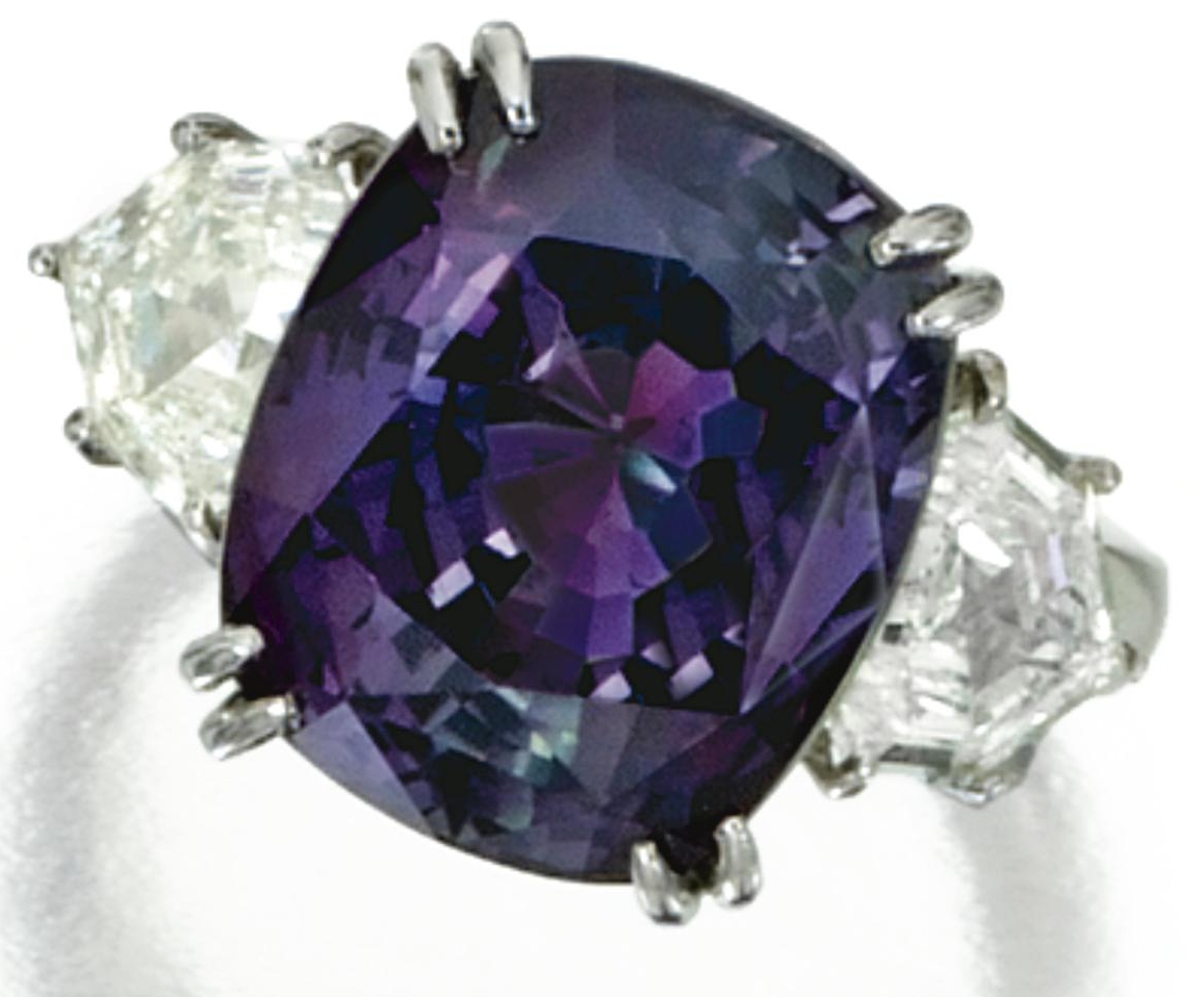 The alexandrite that featured at Sotheby's New York in April 2010 is a 15.86-carat, cushion antique modified mixed-cut Sri Lanka alexandrite, mounted on a platinum ring and flanked on either side by a modified shield-shaped diamond. AGL certified that the stone is a natural Sri Lanka alexandrite with a strong color change. The lot sold for USD 104,500 which was 2.3 times the lower estimate of USD 45,000 and 1.9 times the upper estimate of USD 55,000.