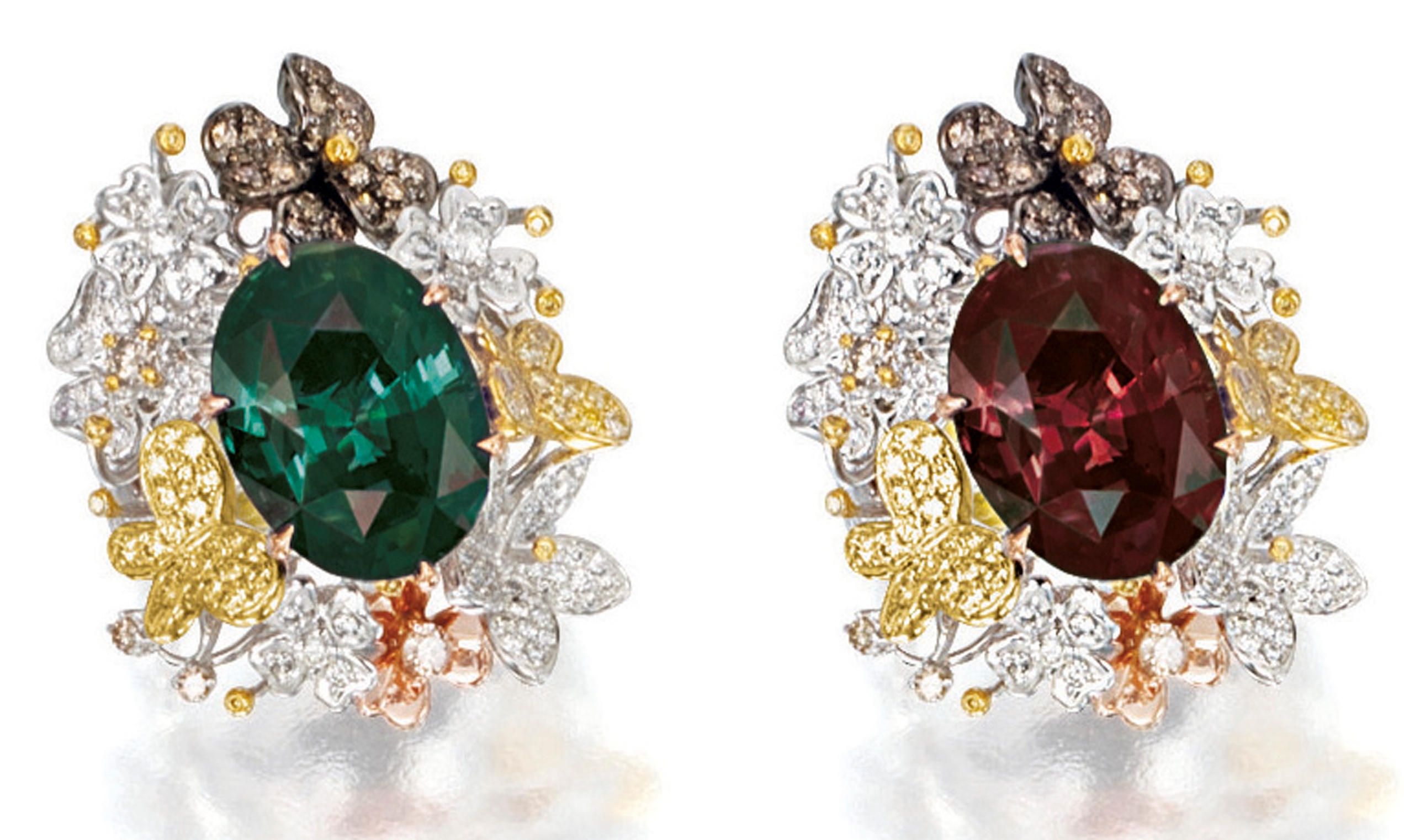 The alexandrite that appeared at Sotheby's Hong Kong Jewels & Jadeite Sale in October 2011, was a 12.00-carat, oval-cut stone of unknown country-of-origin. The alexandrite was set as the centerpiece of a white and yellow gold ring with a butterfly and floral motif surround, set with brilliant-cut colorless, yellow and brown diamonds totaling 1.40 carats. A GRS report certified the natural origin of the stone and its prominent color change from greenish-blue in natural daylight to red in incandescent light. A special comment in the report read as follows :- "very rare combination of size, excellent colour-change, very good clarity and brilliance." The report however, did not specify the country-of-origin of the alexandrite. The lot sold for USD 203,794 within the estimated range of USD 167,679 - 206,374.