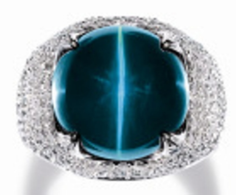 The other catseye alexandrite that appeared in November 2012, had a weight of 9.01 carats with a dramatic color change from dark green in daylight to dark purple in incandescent light, and a very distinct and sharp chatoyancy, highlighted by the dark background colors. The oval-shaped, cabochon-cut, catseye alexandrite was set as the centerpiece of an 18k oxidized gold ring, within an alexandrite surround consisting of 14 oval-shaped alexandrites. An AGL report certified the natural Brazilian origin of the stone, with no gemological evidence of enhancement or treatment. The lot sold within the pre-sale estimate of USD 129,663 - 194,449 for USD 158,196, working out to a ppc value of USD 17,558.