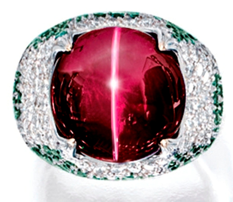 One of the finest catseye alexandrites with an extraordinary color change and prominent chatoyancy, ever to appear at an auction, was the 23.19-carat, round cabochon-cut alexandrite set as the centerpiece of an 18k white-gold ring, with a stylised bombé surround pavé-set with small circular-cut alexandrites and diamonds. Two lab reports by AGL and GGL certified the Brazilian origin of the catseye alexandrite, and its natural status without any treatment, with a well-centered and prominent chatoyancy, very high degree of transparency, and distinct color-change from bluish-green in daylight to reddish-purple in incandescent light. AGL further stated that this is the finest catseye alexandrite of its size the lab has ever examined.