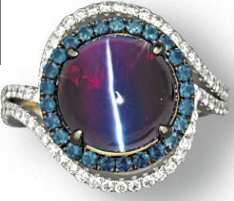 The images of the two catseye alexandrites highlighted by Mike are indeed very stunning. The purple color of the 5.40-carat catseye alexandrite shows that the image was taken in incandescent light. On the other hand the green color of the 9.01-carat catseye alexandrite reveals that its image was taken in daylight. Both rings are of similar design, with the central catseye alexandrite set within an alexandrite surround of smaller alexandrites of varied cuts. What puzzles me about these images is, that while in the second image taken in daylight both the central catseye alexandrite and the oval-cut stones of the alexandrite surround appear green, as they ideally should be, in the second image taken in incandescent light only the central stone appears purple, while the stones of the alexandrite surround appear green, the typicl color in daylight. What is the cause of this apparent contradiction ?