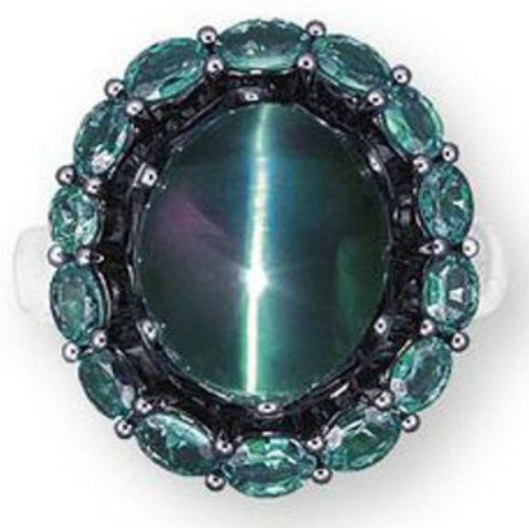 Thanks Mike for your update, and Joan for your sharp observation and gemlite for your subsequent confirmation. It's indeed puzzling how the central 5.40-carat, catseye alexandrite in the first image appears purple the usual color under incandescent light, while the smaller stones in the alexandrite surround appears green, the usual color when exposed to daylight.