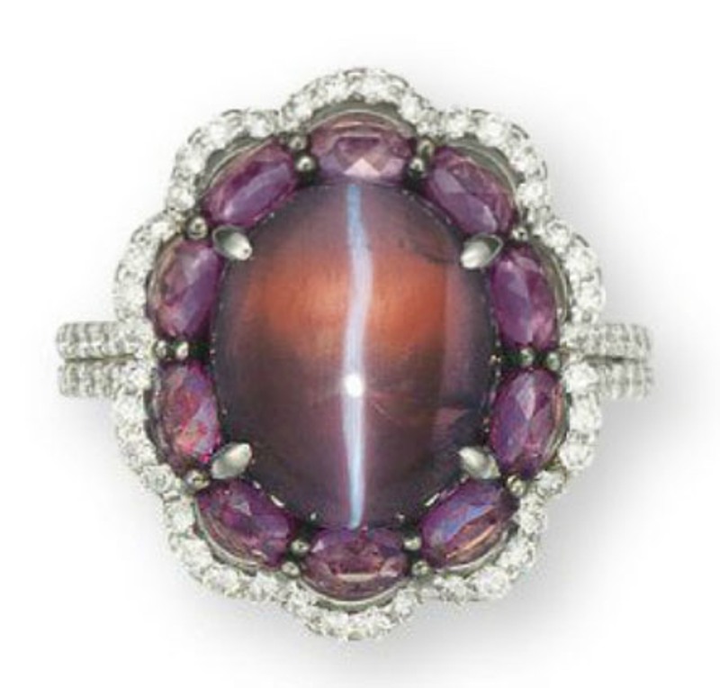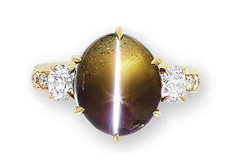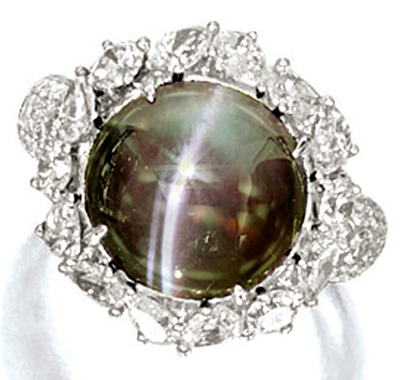 A stunning 10.02-carat, oval cabochon-cut, Ceylon catseye alexandrite with a strong catseye effect and prominent color change from brownish-green in daylight to brownish-purple in incandescent light appeared at Christie's Hong Kong, Jewels : The Hong Kong Sale, held on November 29, 2010. The alexandrite was set as the centerpiece of an 18k yellow-gold ring, flanked by old mine-cut diamonds. The lot was accompanied by two lab reports by SSEF and GRS certifying the alexandrite as a natural chrysoberyl of Ceylon origin, with no indications of any treatment, with strong catseye effect and a moderate color change. A moderate pre-sale estimate of US$16,000 to 26,000 was placed on the ring, which sold above the upper estimate for US$38,820 working out to a ppc-value of US$3874.
