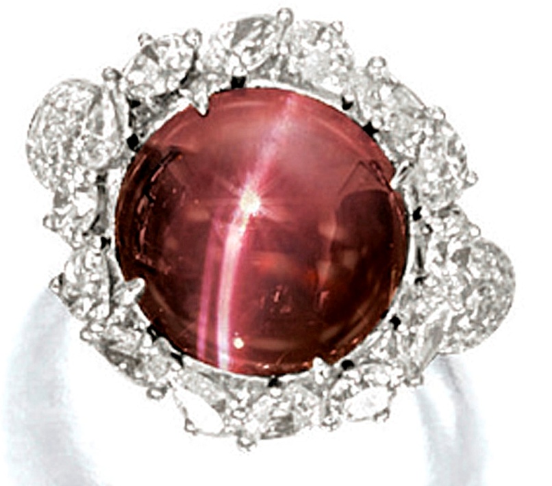 Lot 1523 is a Catseye Alexandrite and Diamond Ring. The ring of floral design is set with a 6.32-carat, oval-shaped, Brazilian catseye alexandrite as centerpiece, within a rose-cut alexandrite surround, and a brilliant-cut diamond trim, mounted in platinum. A GGL report accompanying the lot certified the Brazilian origin of the alexandrite, with a pronounced color change from green in daylight to reddish-purple in incandescent light and a distinct and well-centered chatoyancy. A pre-sale estimate of US$36,292 - $49,253 was placed on the lot, which sold above the upper estimate for US$61,568. The ppc value of the stone works out to US$9,742.