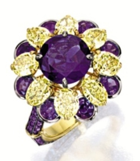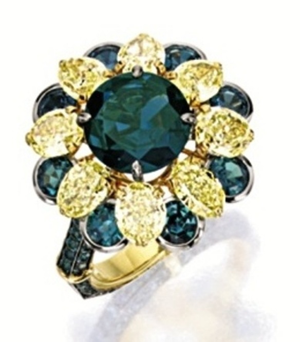 An alexandrite and yellow diamond ring bearing Lot No. 1573, appeared at Sotheby's Hong Kong Magnificent Jewels sale, held on April 8, 2013. The centerpiece of this platinum and yellow-gold ring was a 2.85-carat, circular-cut Brazilian alexandrite, surrounded by eight oval-shaped yellow diamonds, resembling petals of a flower, and eight circular-cut smaller alexandrites mounted at a lower level, alternating with the petals and resembling green sepals of a flower. Total weight of yellow diamonds was 3.95 carats and total weight of circular-cut alexandrites was 3.10 carats. A GGL report accompanying the lot, certified that the 2.85-carat alexandrite is a natural stone of Brazilian origin, with a pronounced color change from green in daylight to purple in incandescent light. A presale estimate of US$42,511 - 48,952 was placed on the lot which sold above the upper estimate for US$51,528, working out to a ppc value of US$8,660 for the alexandrites.