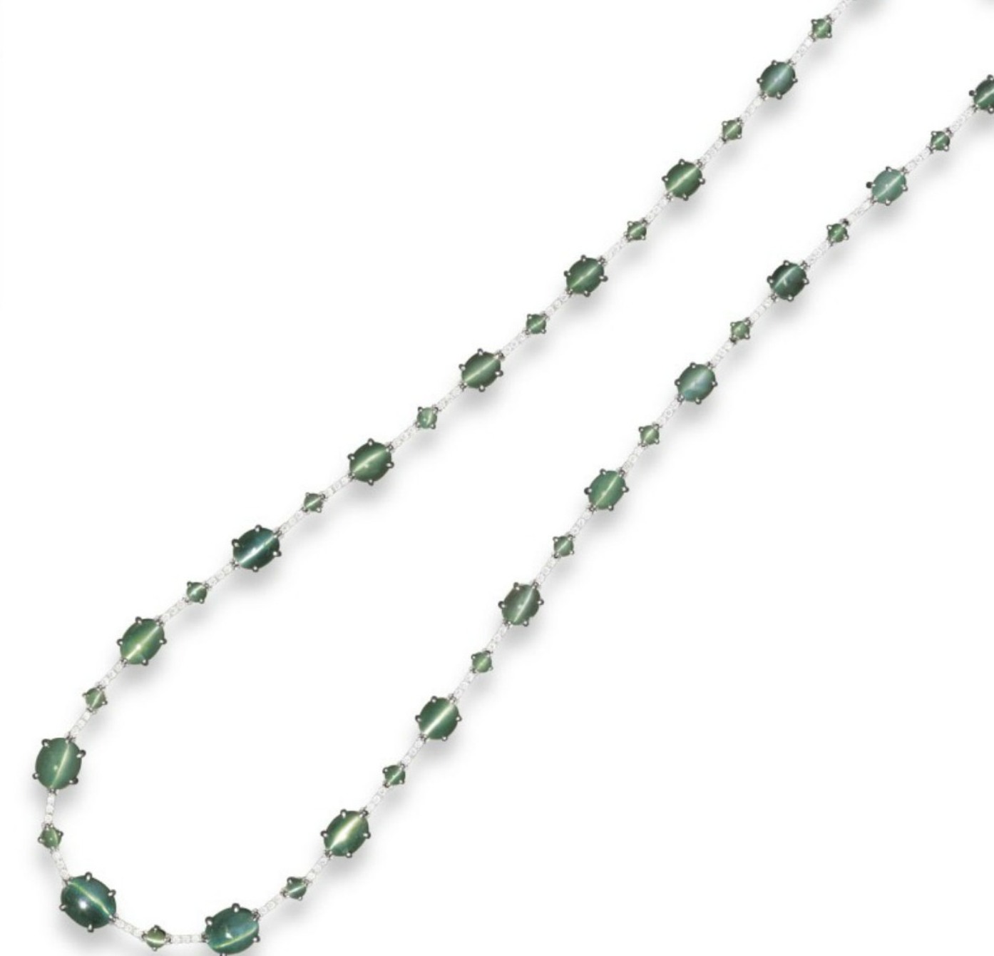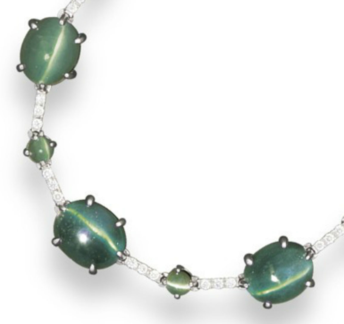 The catseye alexandrite and diamond necklace higlighted by Maryjewel is indeed a very rare piece of jewelry. But, what puzzles me most was how it was possible to assemble together 20 large oval-shaped, graduated catseye alexandrites alternating with 20 small round catseye alexandrites to produce the necklace, when finding just one alexandrite in nature is an extreme rarity. Catseye alexandrites are even rarer than normal alexandrites in nature. Hence, the task of putting together such a necklace becomes more complicated. In the absence of a lab report, one might be led to the conclusion that the catseye alexandrites in the necklace are actually lab-grown or synthetic. Unless, the catseye alexandrite rough stones that were subsequently converted to cabochons, were collected over a period of time, from a prolific source of alexandrites such as the Hematita mine in Brazil or the graduated catseye alexandrites were cut from a larger catseye alexandrite rough crystal, the satellite stones still maintaining the chatoyancy.
