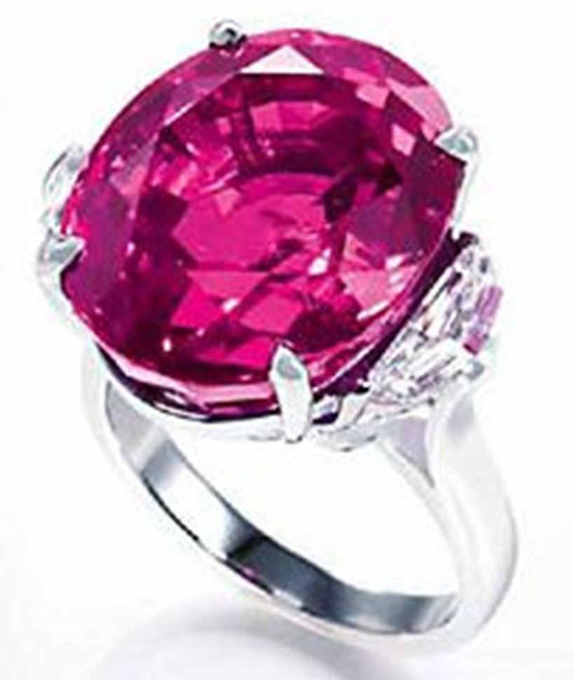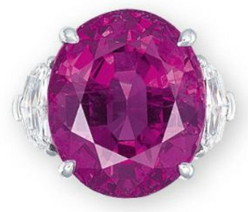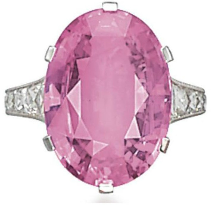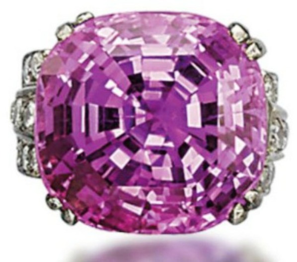 Another stunning Ceylon pink sapphire ring appeared at the Christie's Hong Kong Magnificent Jewels Sale held on November 27, 2012, set with an oval-cut Ceylon pink sapphire weighing 26.19 carats, flanked by step-cut diamonds and mounted in platinum. The AGL certified that the pink sapphire weighing 26.19 carats is a natural Ceylon pink sapphire, with no evidence of heating, with a vivid intense purplish-pink color, complemented by a fine cut and uncharacteristically high clarity that imparts a superior degree of transparency. A pre-sale estimate of US$ 518,698 – 842,884 was placed on this lot, which sold slightly above the upper estimate for US$ 858,168. This works out to a price-per-carat value of US$ 32,767
