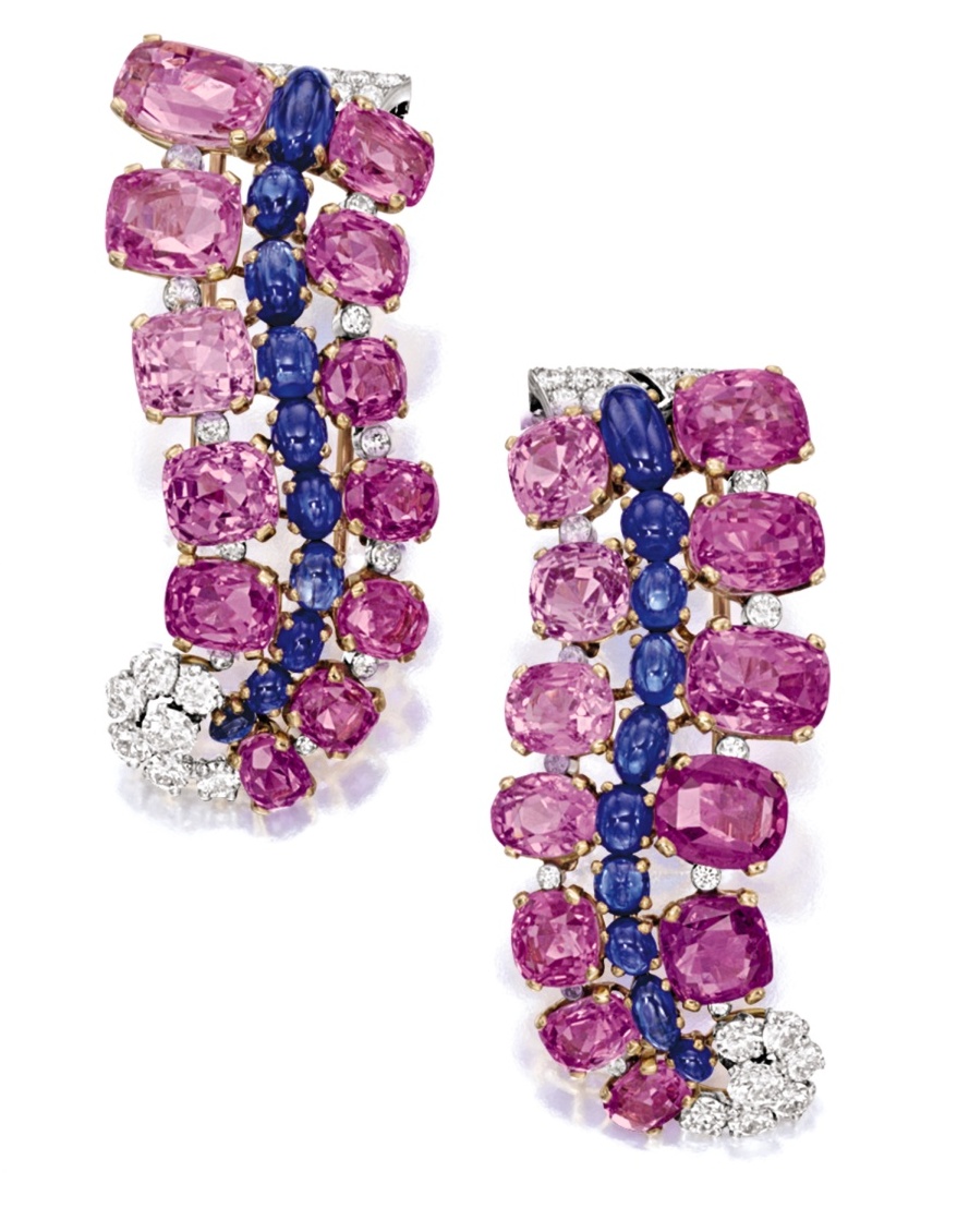 An impressive signed jewel by Cartier - A Pair of Pink Sapphire, Blue Sapphire and Diamond Brooches - designed circa 1950, appeared at Sotheby's Hong Kong Magnificent Jewels and Jadeite Sale, held on April 7, 2014. Each brooch is set with a row of graduated cabochon-cut blue sapphires, with a total weight of 8.00 carats, bordered on either side by cushion-cut and oval-cut Ceylon pink sapphires,with a total weight of 100 carats, and the terminals set with brilliant-cut diamonds, with a total weight of 4.00 carats. The jewels are mounted in platinum and yellow gold. A lab report accompanying the lot, certified that the 100 carats of pink sapphires are natural Ceylon pink sapphires with no indications of heating.