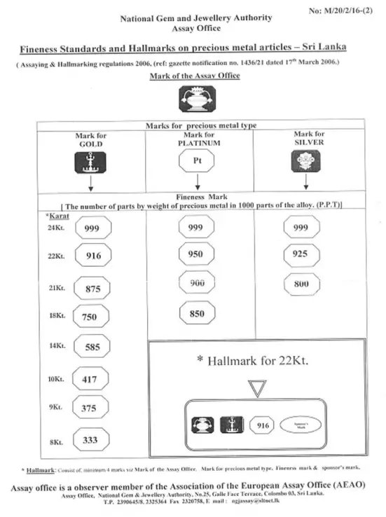 The Sri Lanka Assay Office is a member of the European Assay Offices whose head office is based in Geneva, Switzerland. The assay office in Sri Lanka also has plans to join the hallmarking convention.