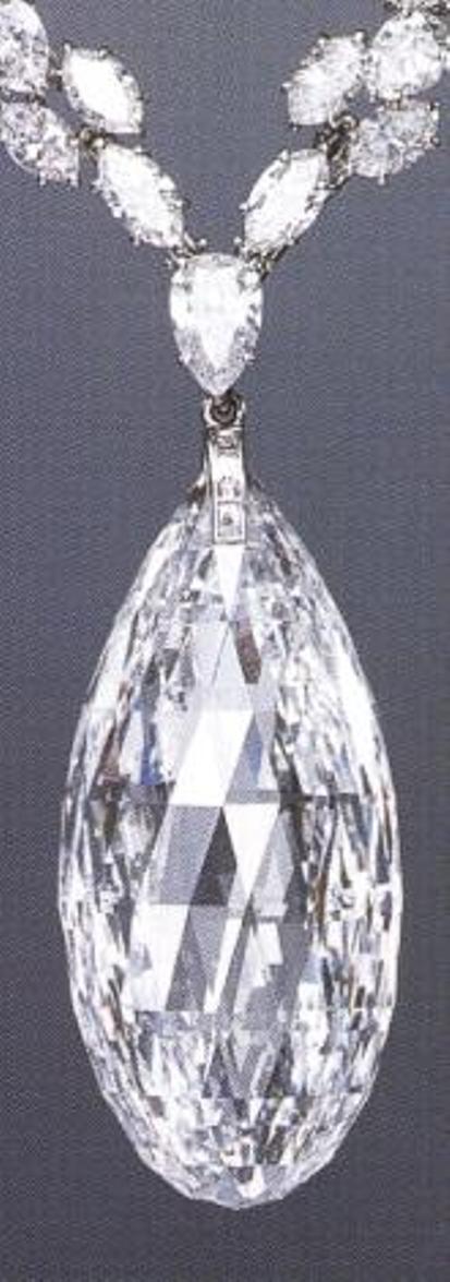 14) Star of the East Diamond - A 94.80-carat, antique pear-cut, Type IIa, D-color Golconda stone, of unknown clarity grade, mounted as a pendant to a necklace, below a hexagonal emerald of 34 carats and a pearl of 32 grains. Part of the collection of jewels of Sultan Abdul Hamid II (1876-1909) of Turkey.