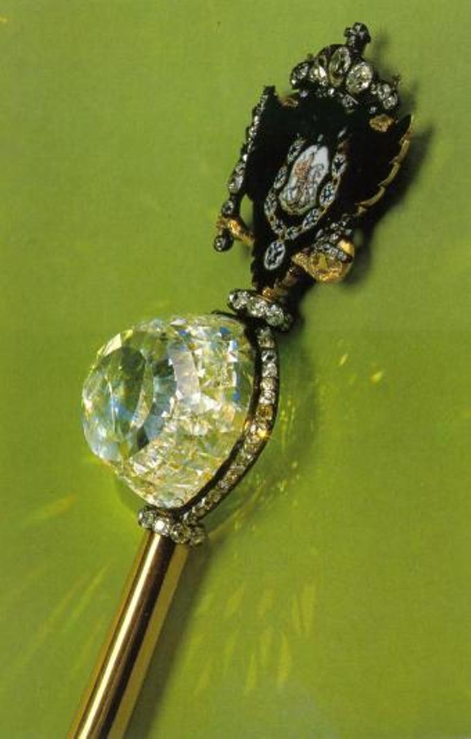 10) The Orlov Diamond - A 189.62-carat white Golconda diamond, with the characteristic faint bluish-tinge, dimensions of 47.6 x 34.92 x 31.75 mm and an antique Indian rose-cut, presented by Count Grigory Grigoryevich Orlov to Empress Catherine the Great (1762-96), who got it mounted on the Imperial Scepter, in which setting it is preserved up to this day, among the treasures of the Kremlin Diamond Fund.