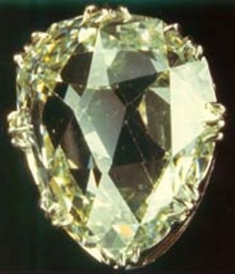 12) The Great Sancy Diamond - A 55.23-carat shield-shaped stone, without a pavilion; also one of the first large diamonds to be cut with symmetrical facets like the Beau Sancy; almost colorless Golconda diamond, with a very faint, pale, greenish-yellow tint; the most celebrated diamond in history, having passed through more countries, and affected more royal families than any other diamond in history.