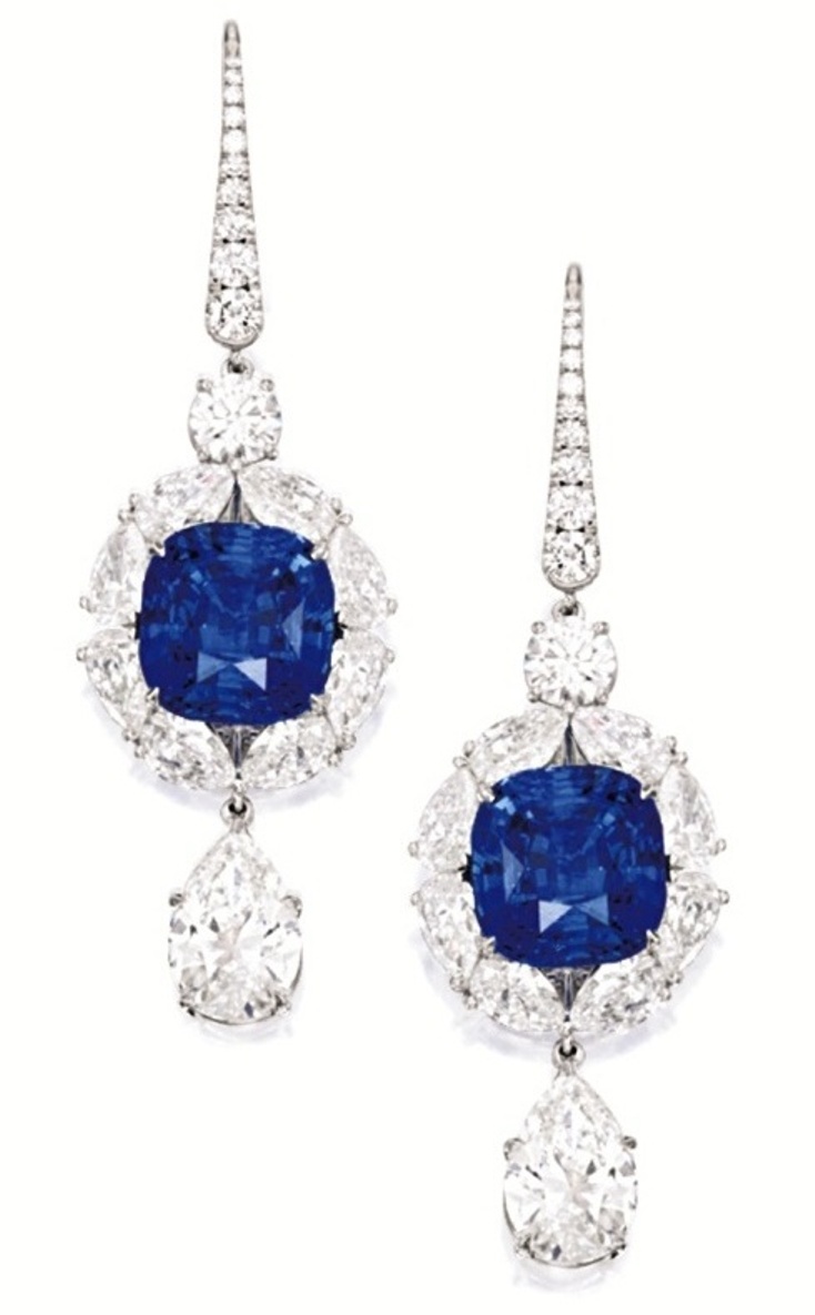 Lot 1779 - was a Pair of Sapphire and Diamond Pendant Earrings - The centerpiece of each pendant earring, was a cushion-shaped Ceylon sapphire, weighing 8.90 carats and 7.86 carats, surrounded by a row of 8 pear-shaped diamonds and another pear-shaped diamond, the largest in the earring, suspended from below, surmounted by a circular-cut diamond; the whole arrangement being suspended from an elongated inverted cone-shaped structure, also set with circular-cut diamonds, that is fixed to the lobe of the ear by a post earring arrangement. . A pre-sale estimate of USD 70,851 - 83,733 was placed on the lot which sold slightly above the upper estimate for USD 88,564 working out to a ppc-value of USD 5,284.
