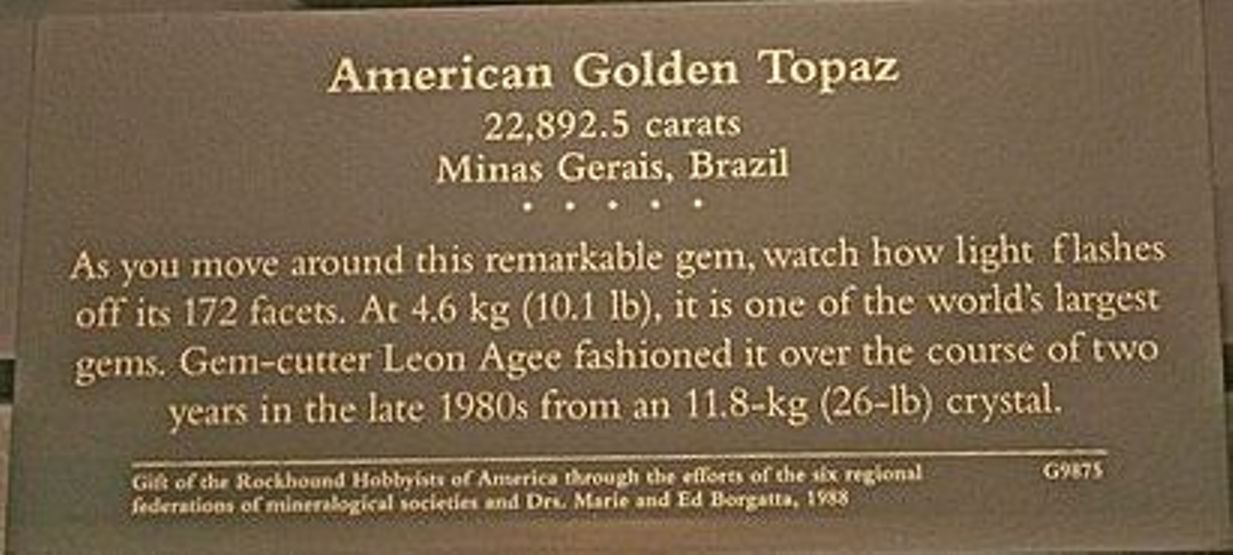 We reproduce below an enlarged photograph of the American Golden Topaz as displayed in the National Museum of Natural History of the Smithsonian Institution, and an enlargement of the Museum Card at the base of the exhibit.