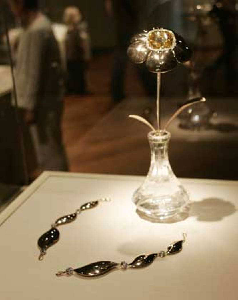 The "Ceylon Sinflower" is another special setting from the Michael Scott Collection. It is actually a model of an almost life-size sunflower incorporating a 400.6-carat Ceylon Yellow Sapphire as its centerpiece, mounted in 18 karat red gold and accented with diamonds. The sunflower is mounted on a stem in a rock crystal vase. The Sunflower is a common flower of tropical countries like Sri Lanka (Ceylon), and since the main gemstone incorporated in the flower, the Yellow Sapphire, originated from Sri Lanka, the designers of this piece opted to create a flower commonly found in Sri Lanka, and named it the "Ceylon Sunflower"