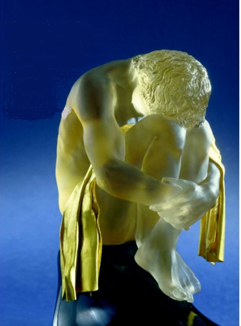 The most stunning pieces in the Michael Scott Collection are without any doubt the numerous carvings and sculptures which he acquired from the renowned gem-carving villages of Idar-Oberstein in Germany, where the ancient tradition of gem-carving is believed to have existed since the period of the ancient Roman Empire. The collection includes 13 gem carvings by contemporary German artist Bernd Munsteiner and four intricate carvings of animals by German artist Gerd Dreher. However, the most striking of all the gem-carvings is "The Repose" by Gunter Petty of Idar-Oberstein executed in 1991, representing a nude male youth in the squatting position, carved out of an enormous quartz crystal, sitting on an obsidian base, with an 18-karat gold cloth draped over his lap; the whole sculpture weighing 9,000 carats.